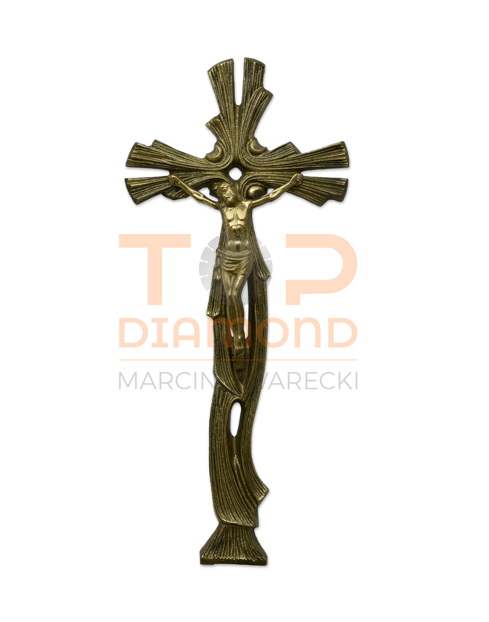 Krzyż mosiężny z wizerunkiem rzeźbiony w kolorze złotym.