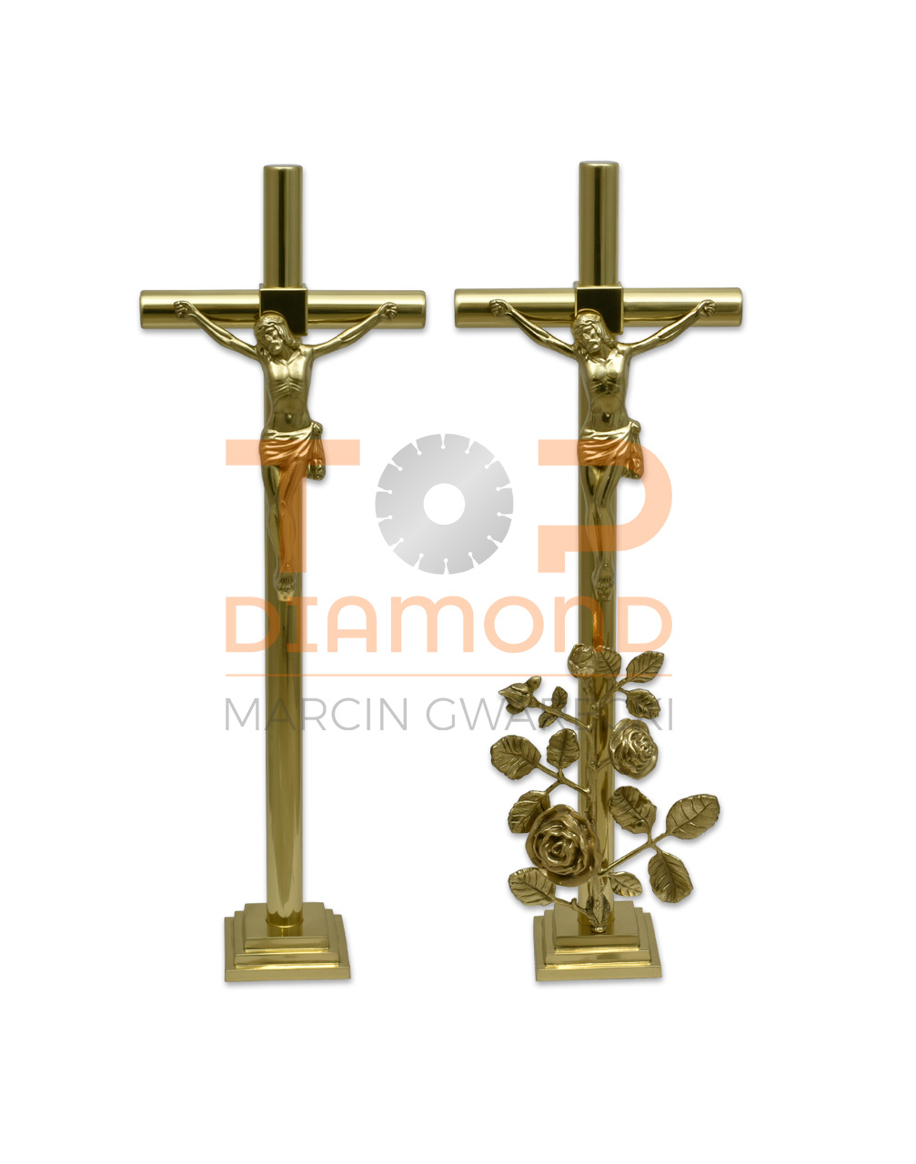 Krzyż z wizerunkiem mosiężny z różą lub bez róży w kolorze złotym.