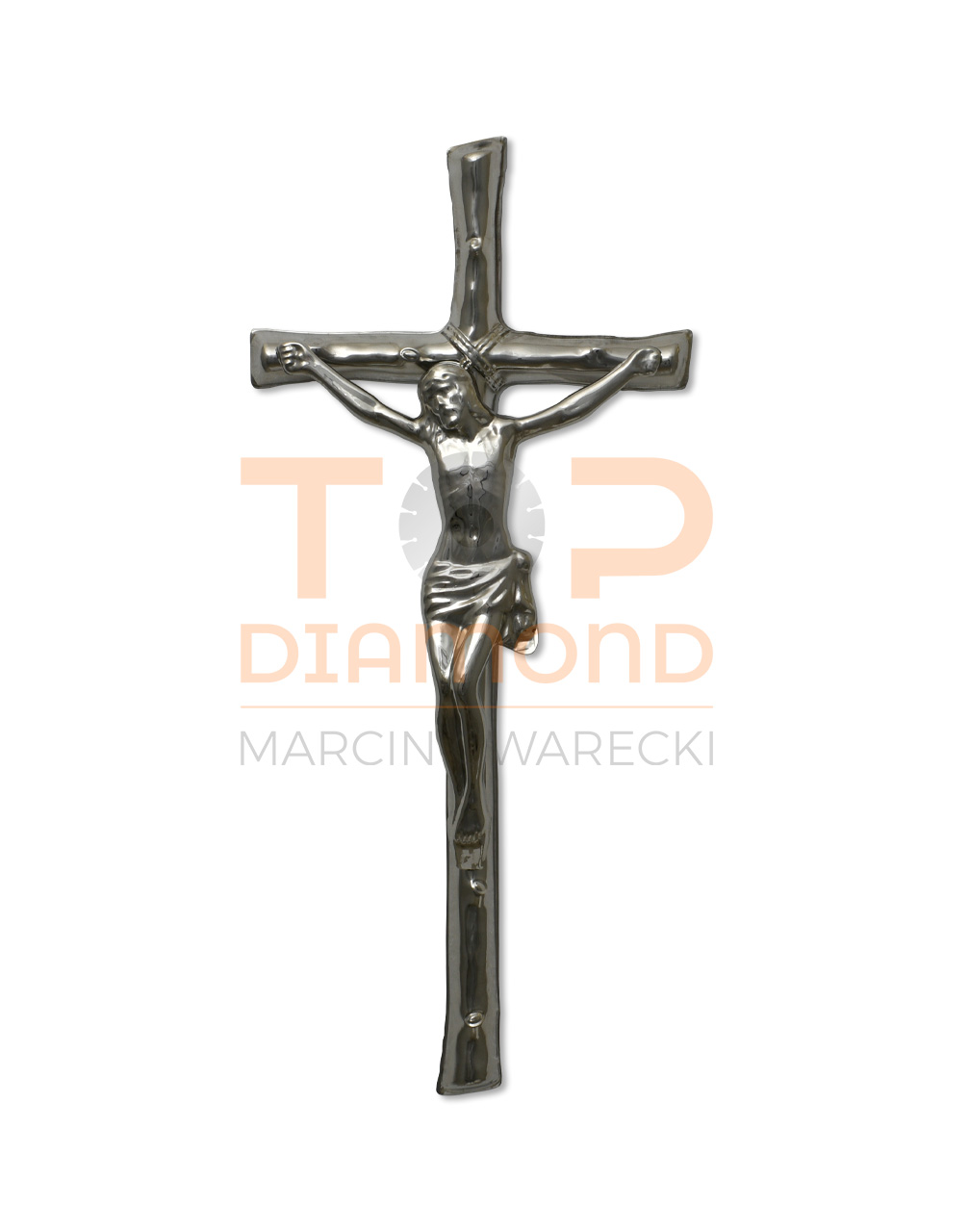 Krzyż wykonany z wytłaczanej blachy nierdzewnej, na którym znajduje się wytłoczony wizerunek Pana Jezusa.
